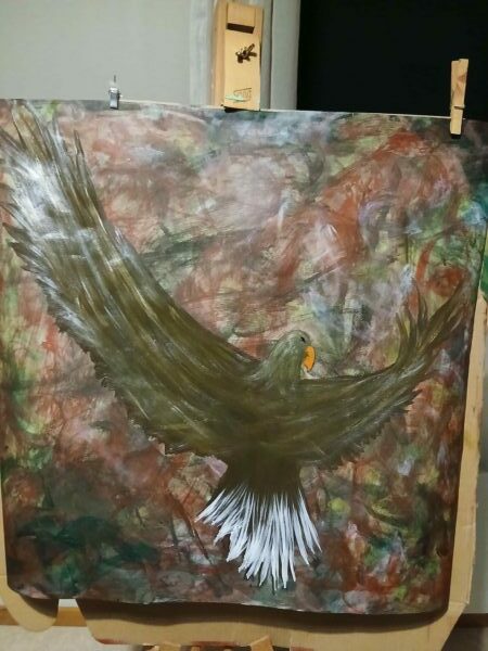 Ny Kjøp Bilde/malerier, Håndlaget i Norge., Siliam design., Sjø-samisk Abstrakt plakat-maleri; “Havørn i rød soloppgang” kr 670