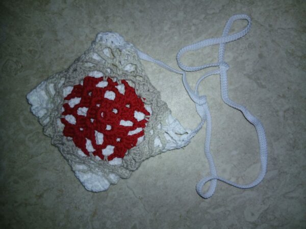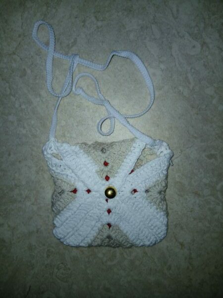 Ny Kjøp Boho, Håndlaget i Norge., Klær, Siliam design., Sjø-samisk, Veske Heklet veske til kort og mobil med knapp og reim. Beige, hvit og rød. kr 200
